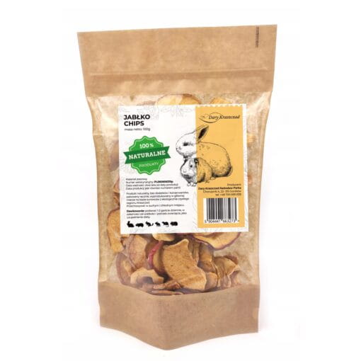 - pakowany w opakowania strunowe, aby Twój zwierzak mógł dłużej cieszyć się świeżością i właściwościami chipsów z jabłka