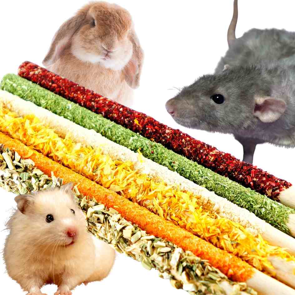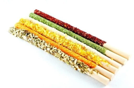 Gryzaki składające się z gałązek bezpiecznie oklejonych kawałkami marchewki, jeżówki, pasternaka, nagietka, hibiskusa i pietruszki. W opakowaniu znajduje się 6 patyczków, każdy w innym smaku.