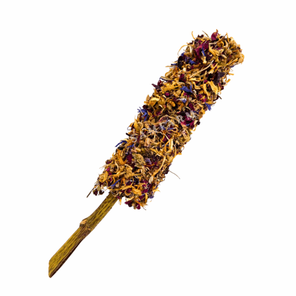 Każda kolba FARMERKI powstaje na naturalnym patyczku z gałązki jeżówki, która również jest jadalna i bogata w cenne związki roślinne. To nie tylko wygodne i estetyczne mocowanie kolby – to także dodatkowa przekąska na sam koniec farmerkowej uczty.