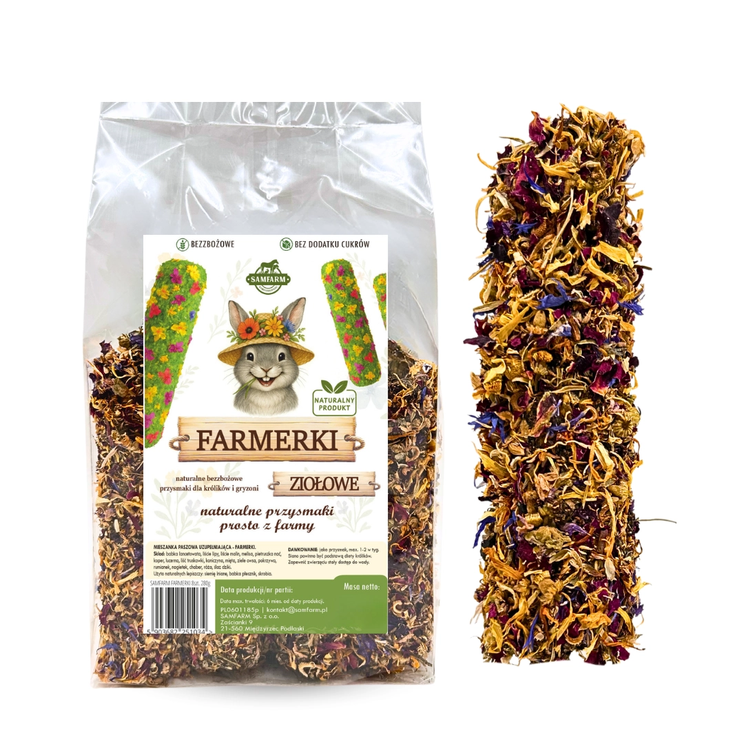 Nasze kolby powstają z suszonych ziół, liści i kwiatów. Udało nam się uzyskać idealnie chrupiący produkt z ziół, który nie jest twardy jak kamień. Farmerki kruszą się w pyszny, naturalny sposób, dzięki są w pełni bezpieczne dla delikatnego układu pokarmowego królików i gryzoni. Zioła w FARMERKACH mają drobno rozdrobnioną, ale nie sproszkowaną strukturę – widać w nich małe kawałki liści, łodyżek i płatków. Dzięki temu królik czy gryzoń może je pogryźć, poczuć teksturę i naturalny smak roślin, a nie jeść pył czy zbitą masę.
