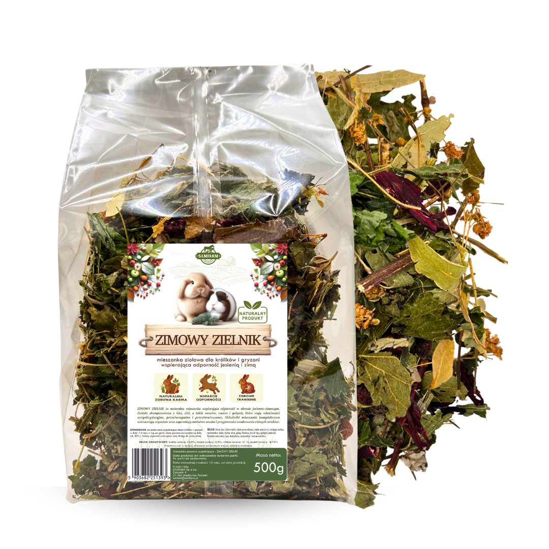 „Zimowy zielnik” to idealne urozmaicenie diety królików, można ją podawać od 2 do 3 razy w tygodniu. Wraz z naszą mieszanką podstawową ,,Same ziółka” stworzą idealny ziołowy zimowy duet w diecie każdego królika!