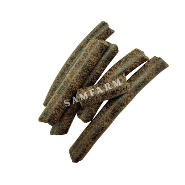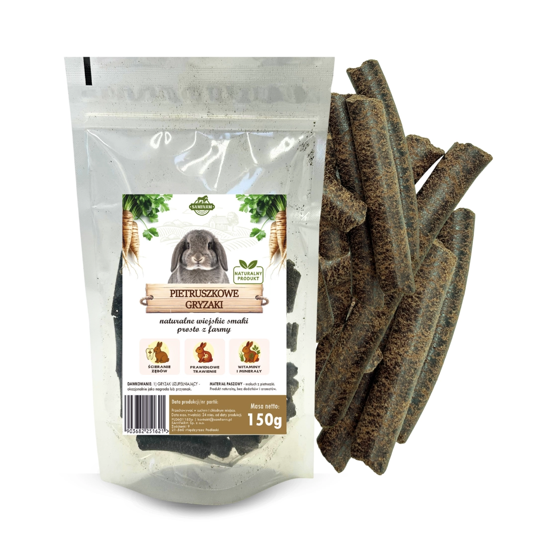 Gryzaki pietruszkowe SAMFARM to w 100% naturalna przekąska roślinna dla królików i gryzoni, powstająca z suszu – wytłoków pietruszkowych. Wytłoki pietruszkowe to wartościowy składnik o wysokiej zawartości naturalnego błonnika oraz związków bioaktywnych. Produkt nie zawiera dodatku cukru, sztucznych barwników ani konserwantów. Dzięki dużej ilości włókna wspiera prawidłowe funkcjonowanie układu pokarmowego i pomaga w utrzymaniu dobrej perystaltyki jelit. Pietruszka jest naturalnym źródłem witamin, takich jak witamina C i K oraz kwas foliowy, a także minerałów, m.in. potasu, wapnia i żelaza, które korzystnie wpływają na odporność i ogólną kondycję organizmu. Zawarte w niej przeciwutleniacze wspomagają ochronę komórek przed stresem oksydacyjnym. Dodatkowo lekko włóknista struktura gryzaków sprzyja naturalnemu ścieraniu zębów, co ma duże znaczenie w codziennej diecie królików i gryzoni.